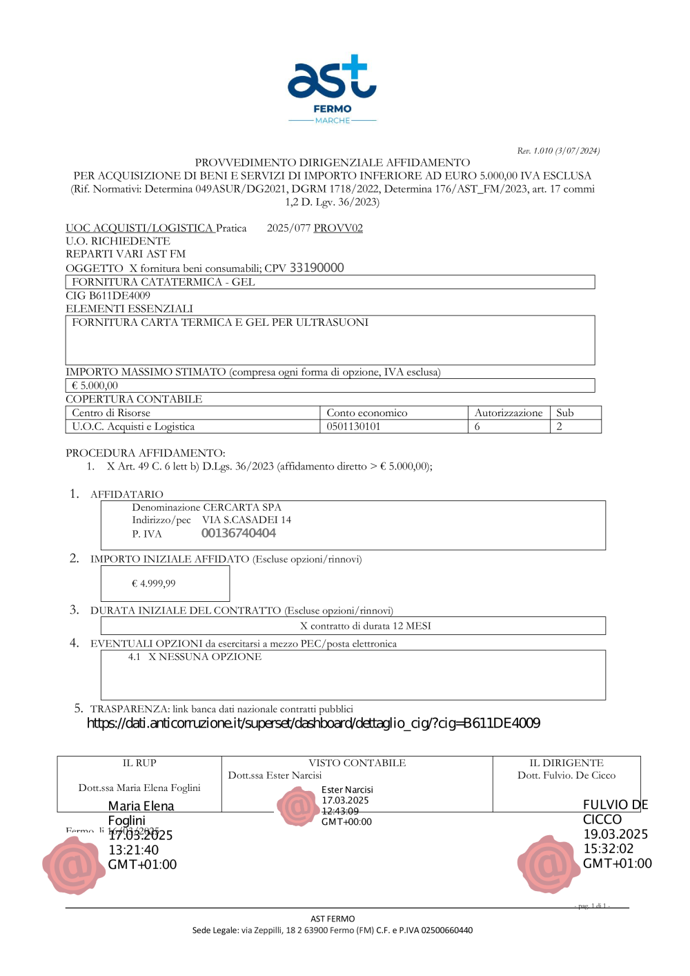 PROVVEDIMENTO DIRIGENZIALE AFFIDAMENTO INFERIORE A 5000 €