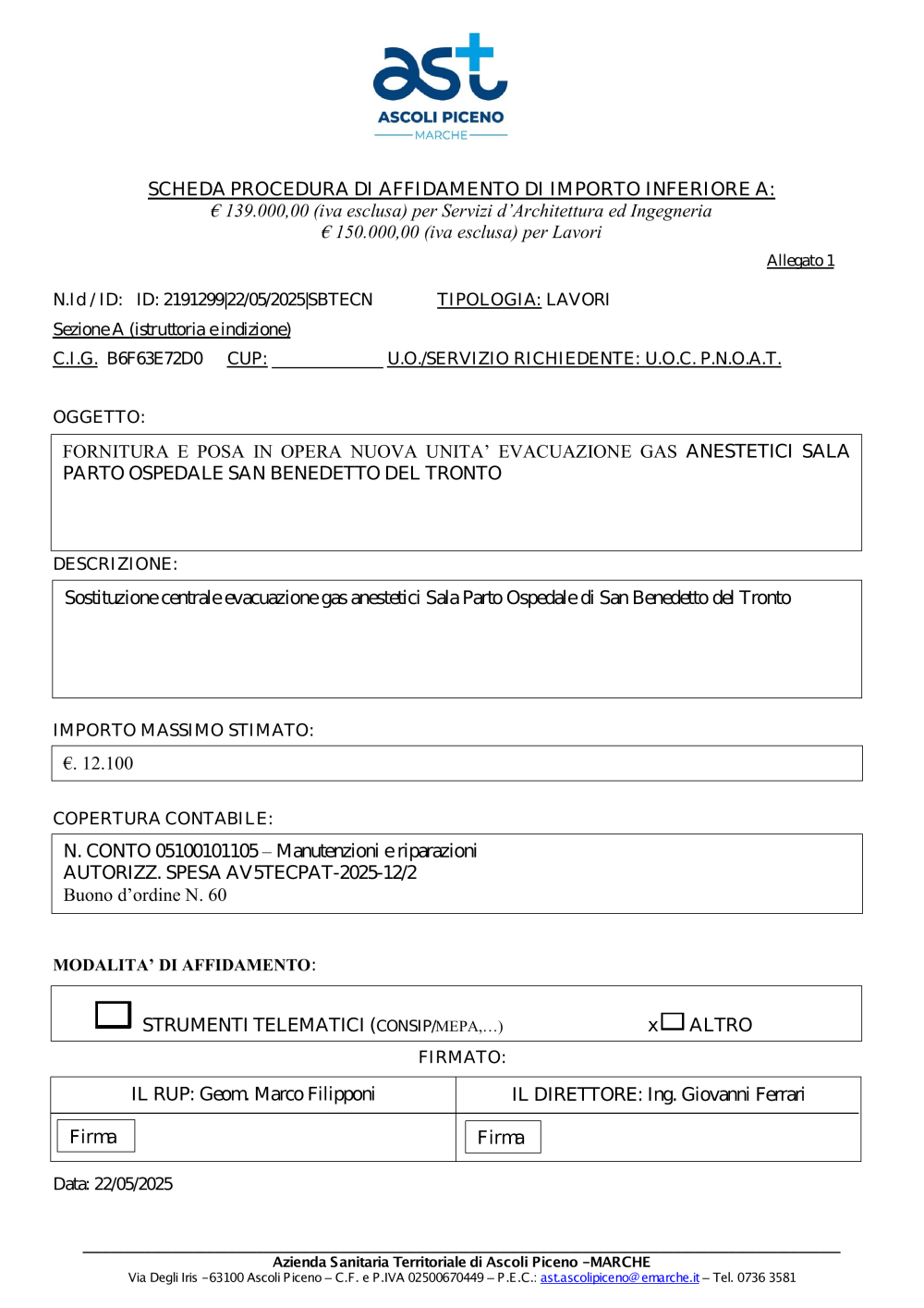 - 2025 SCHEDA FORNITURA E POSA IN OPERA NUOVA UNITA’ EVACUAZIONE GAS ANESTETICI SALA PARTO OSPEDALE SAN BENEDETTO DEL TRONTO
