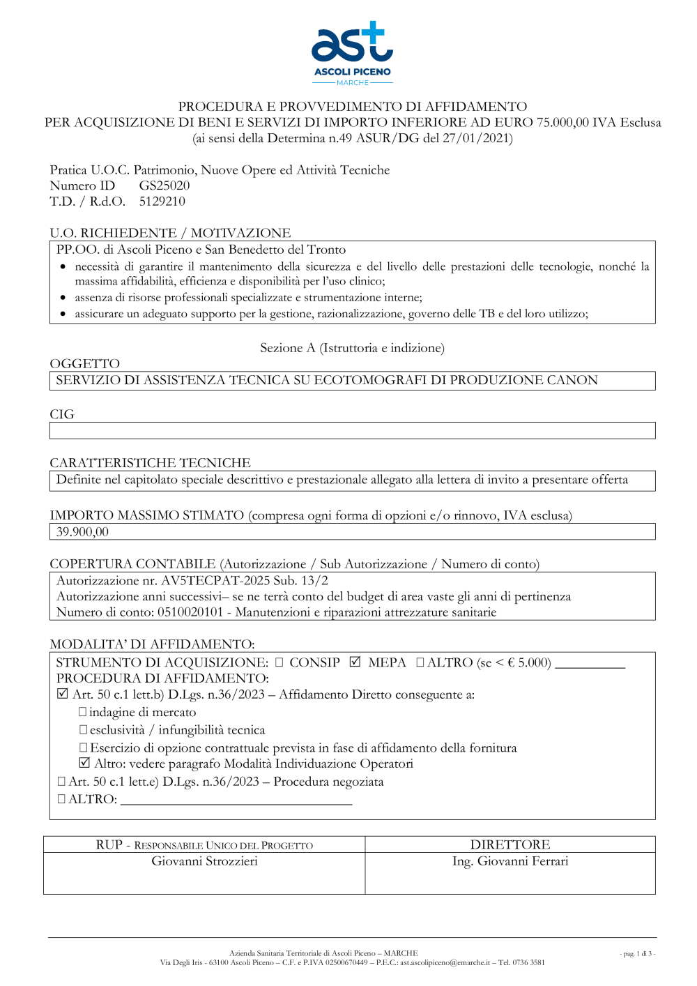 2025 SCHEDA AFFIDAMENTO SERVIZIO DI ASSISTENZA TECNICA SU ECOTOMOGRAFI DI PRODUZIONE CANON