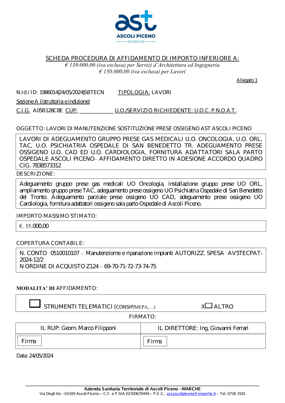 - SCHEDA AFFIDAMENTO LAVORI SOSTITUZIONE PRESE GAS MEDICALI AST DI ASCOLI PICENO