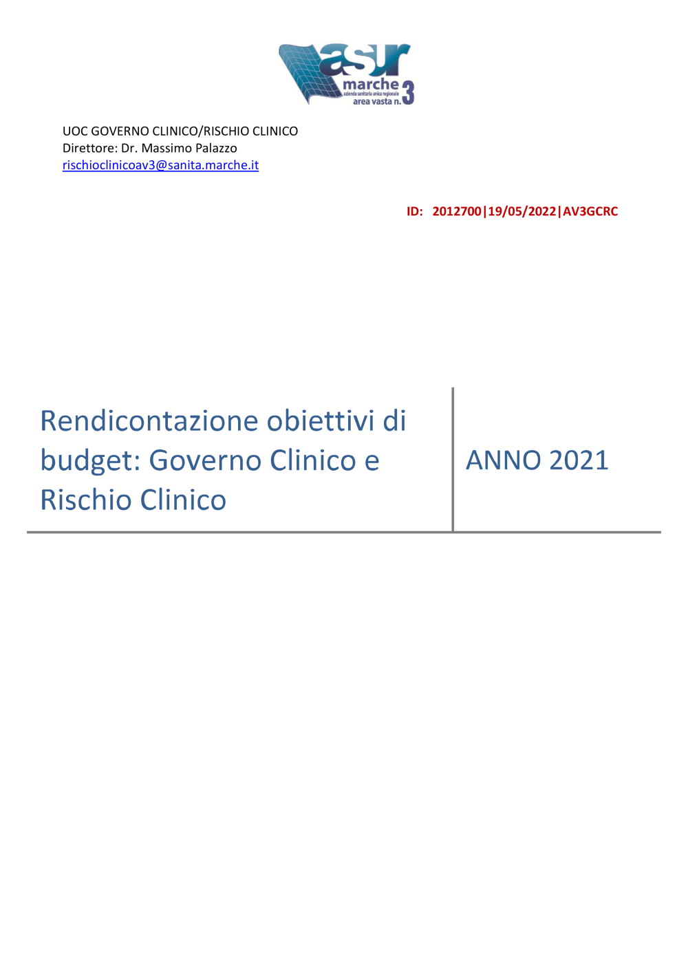 Rendicontazione obiettivi di budget: Governo Clinico e Rischio Clinico