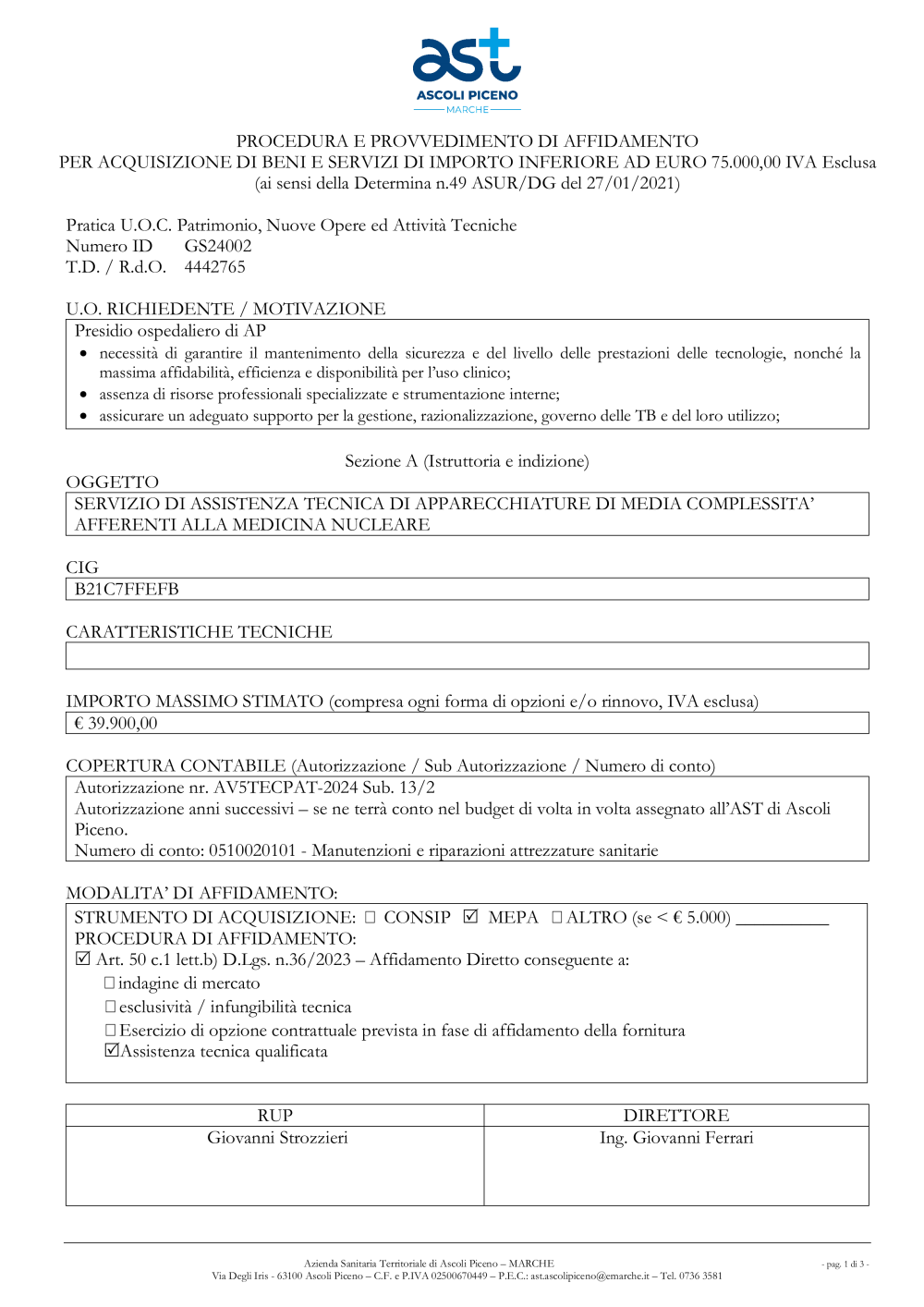 - AFFIDAMENTO SERVIZIO DI ASSISTENZA TECNICA DI APPARECCHIATURE DI MEDIA COMPLESSITA’ AFFERENTI ALLA MEDICINA NUCLEARE