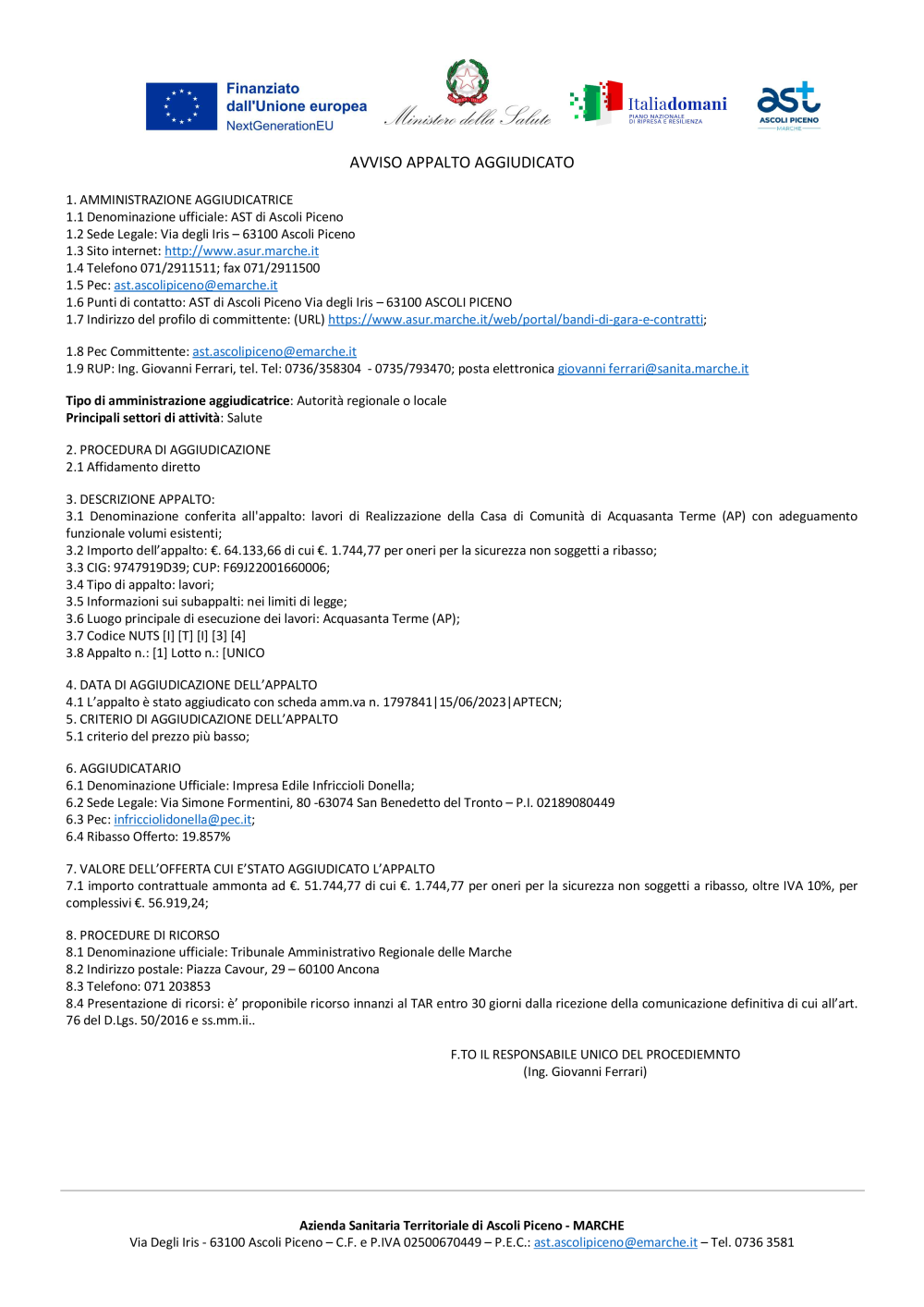Avviso appalto aggiudicato per lavori Realizzazione Casa di Comunità di Acquasanta Terme con adeguamento funzionale volumi esistenti