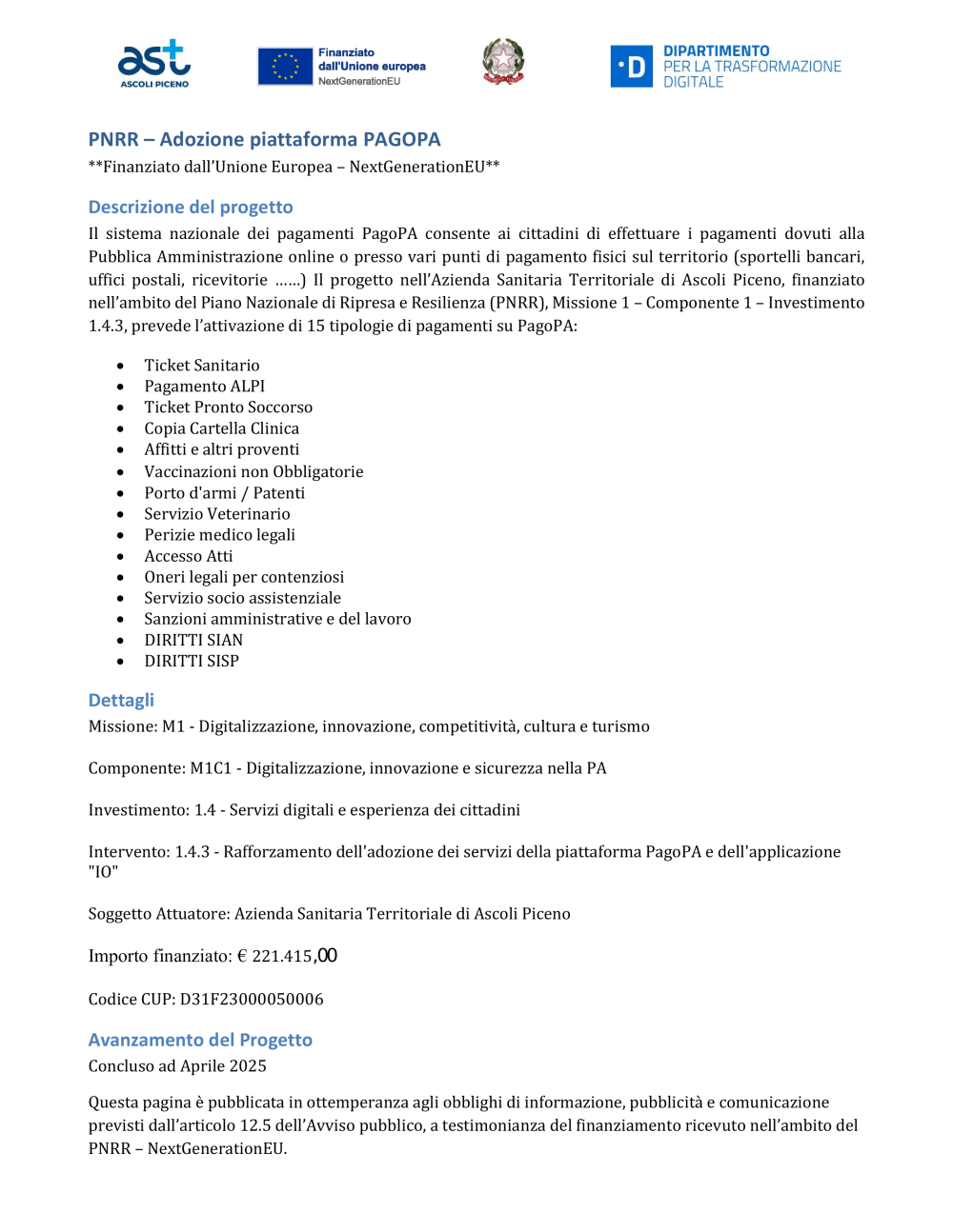 PNRR Missione 1 – Componente 1 – Investimento 1.4.3 - "Rafforzamento dell'adozione dei servizi della piattaforma PagoPA e dell'applicazione "IO"