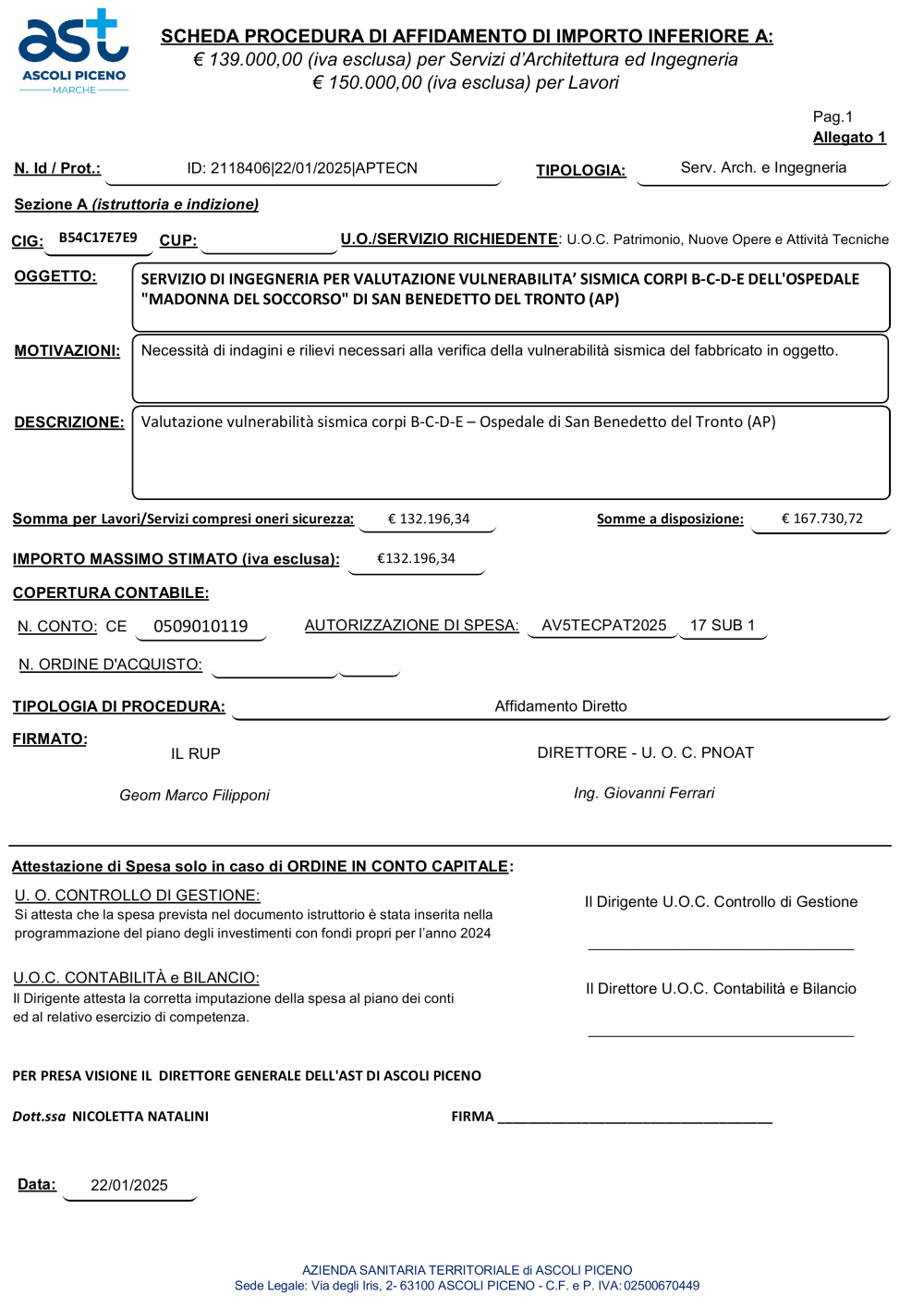 2025 SCHEDA AFFIDAMENTO SERVIZIO INGEGNERIA PER VALUTAZIONE VULNERABILITA’ SISMICA CORPI B C D E OSPEDALE MADONNA DEL SOCCORSO DI SAN BENEDETTO DEL TRONTO