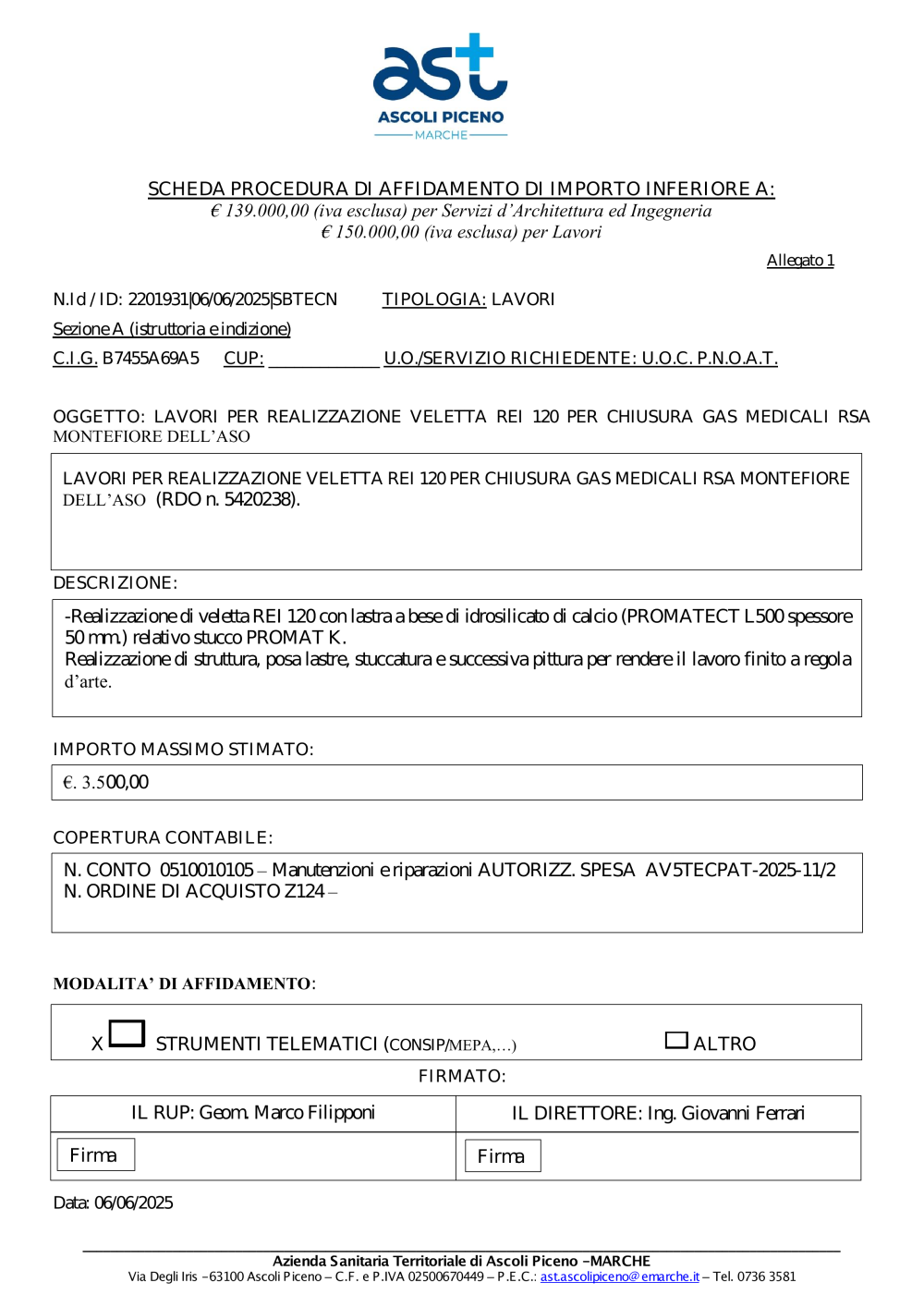 - 2025 SCHEDA AFFIDAMENTO LAVORI PER REALIZZAZIONE VELETTA REI 120 PER CHIUSURA GAS MEDICALI RSA MONTEFIORE DELL’ASO