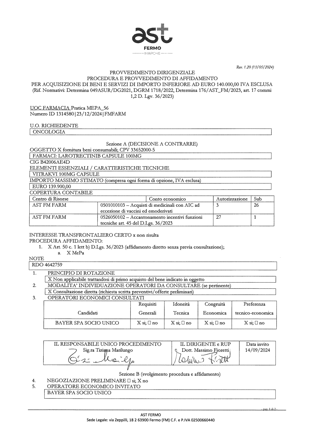 FORNITURA FARMACI LAROTRECTINIB_BAYER SPA