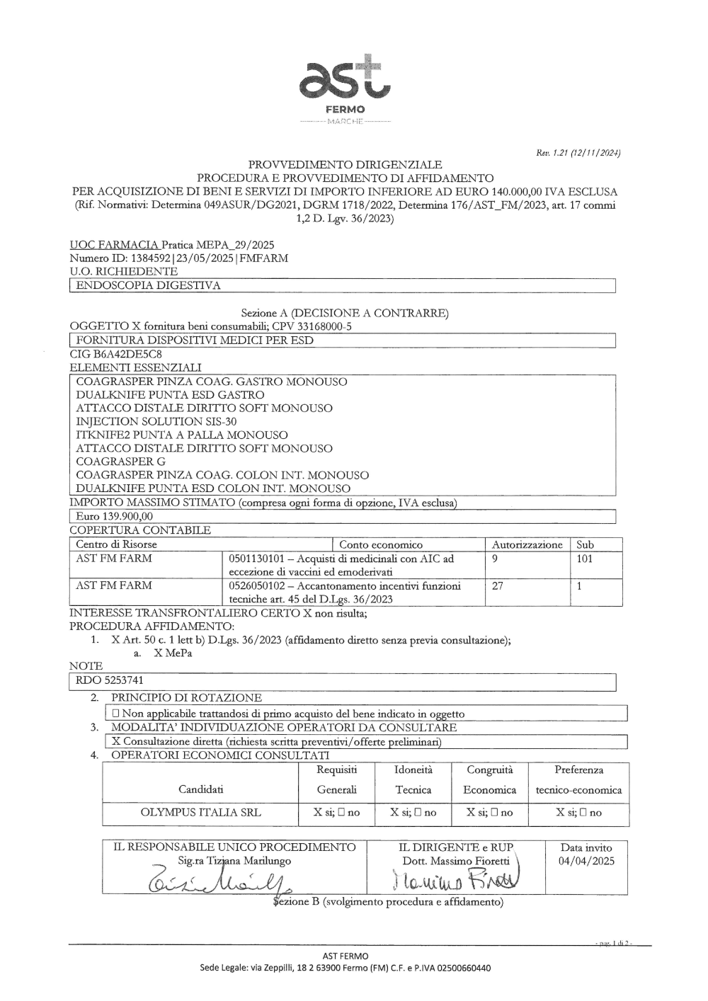FORNITURA DISPOSITIVI MEDICI PER ESD_OLYMPUS ITALIA SRL